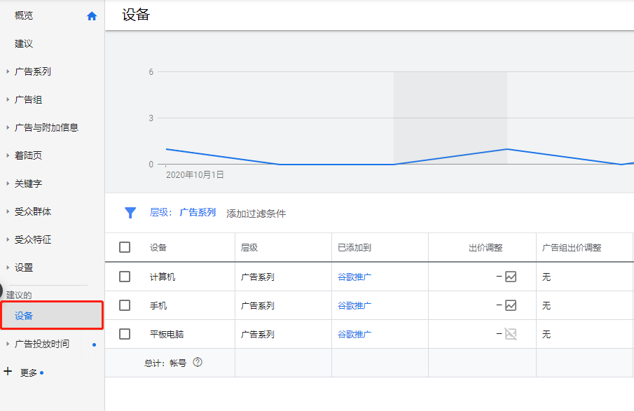 在这个页面中可以知道手机、电脑和平板各自的效果。在一些情况下,你可以给手机或电脑更多预算,借此最大化广告效果。