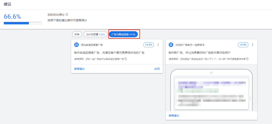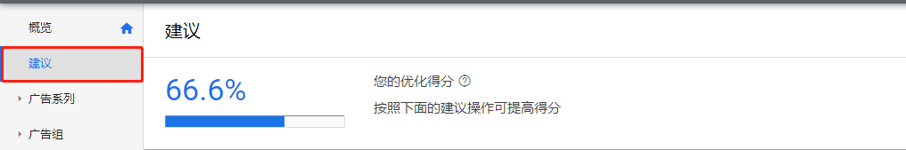 Google Ads "建议"功能可以为广告主提供快速的分析归纳建议,帮助广告主改善广告的投放效果。